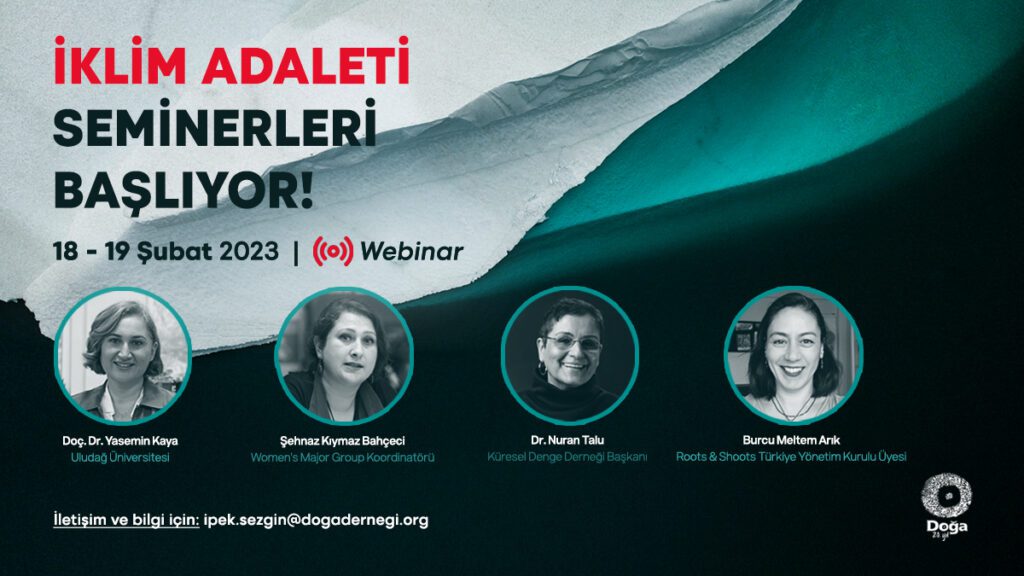 İklim adaleti çalışmaları kapsamında gerçekleştireceğimiz ilk webinar 18-19 Şubat 2023’te çevrimiçi gerçekleşecek. Konusunda uzman Doç. Dr. Yasemin Kaya, Dr. Nuran Talu, Şehnaz Kıymaz Bahçesi ve Burcu Meltem Arık ile iki gün boyunca birlikte olacağımız webinarda ‘İklim Adaleti’ kavramından başlayarak uluslararası alandaki gelişmelere, strateji ve politikalara, iklim değişikliğinin toplumsal cinsiyet boyutuna ve gelecek nesillerin haklarına değineceğiz.